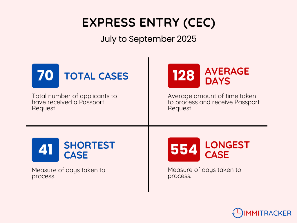 A total of 70 applicants for the Canadian Experience Class (CEC) program received their PPR, averaging about 128 days or 4.3 months in processing times. This is a slight decrease compared to processing times in Q3 (153 days).