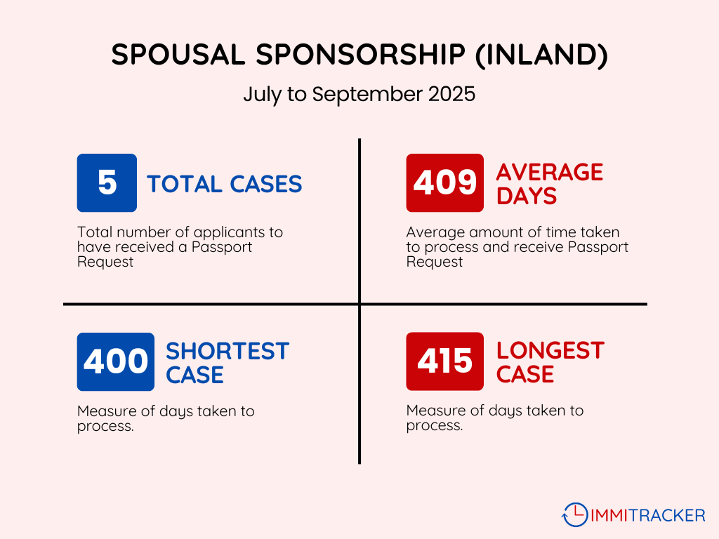 Inland Spousal Sponsorship remains very consistent with almost no variation in timelines from case-to-case. It is also quite slower than the Outland Spousal Sponsorship with an almost 100 day extra wait time